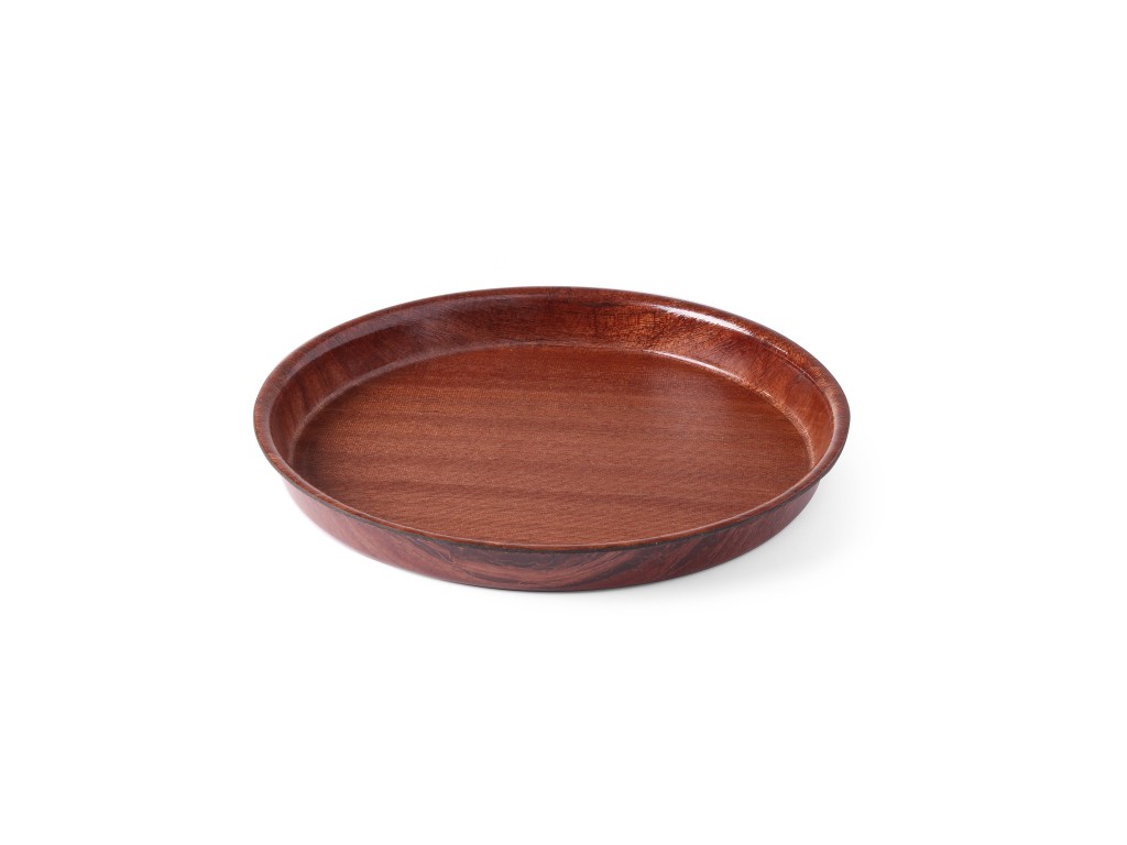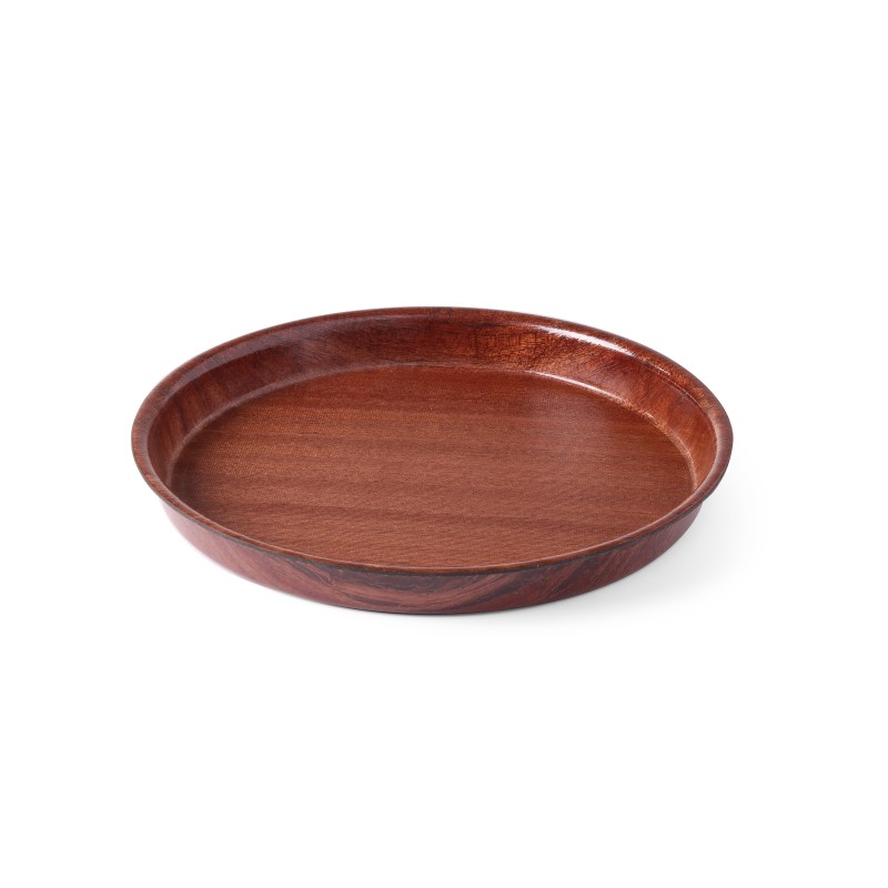 Dienblad Woodform Rond met hoge rand is gemaakt met hout versterkt laminaat en antislip laag. Hij is schok- en breukbestendig. Hij kan in de vaatwasser en is hittebestendig van -10C tot +100C.